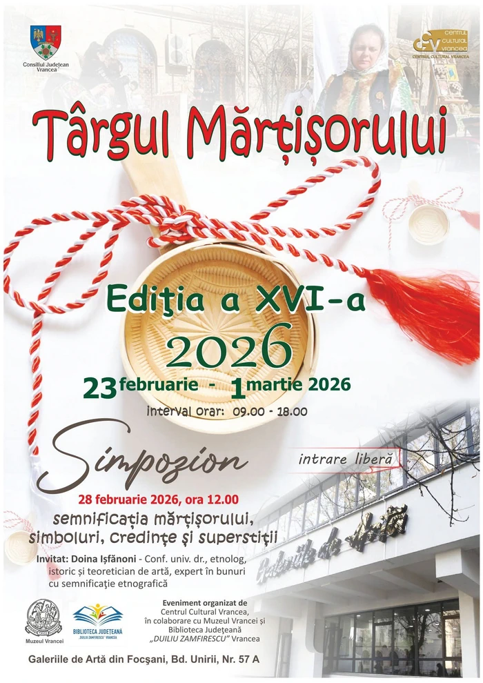 📅 Sâmbătă, 28 februarie 2026, de la ora 12:00, vă așteptăm și la Simpozionul „Semnificația mărțișorului – simboluri, credințe și superstiții”, susținut de conf. univ. dr. Doina Ișfănoni, pentru a redescoperi rădăcinile și sensurile acestui gest atât de românesc. În plus, atelierele pentru elevi și întâlnirea cu meșterii populari și creatorii hand-made din Vrancea transformă târgul într-un spațiu viu de învățare și solidaritate.