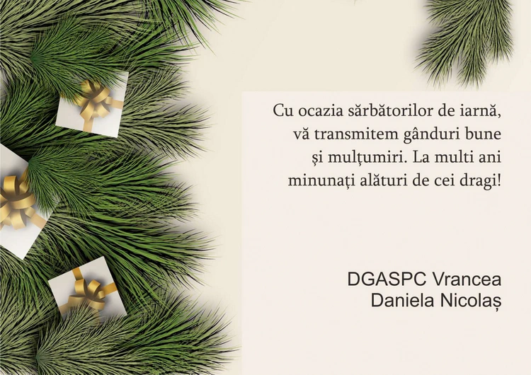 Cu prilejul Sărbătorii Nașterii Domnului, DGASPC Vrancea transmite întregii comunități gânduri de pace, lumină și recunoștință. Crăciunul ne reamintește că adevărata bogăție stă în solidaritate, în atenția față de cel de lângă noi și în puterea de a dărui, chiar și printr-un gest simplu sau o vorbă bună.