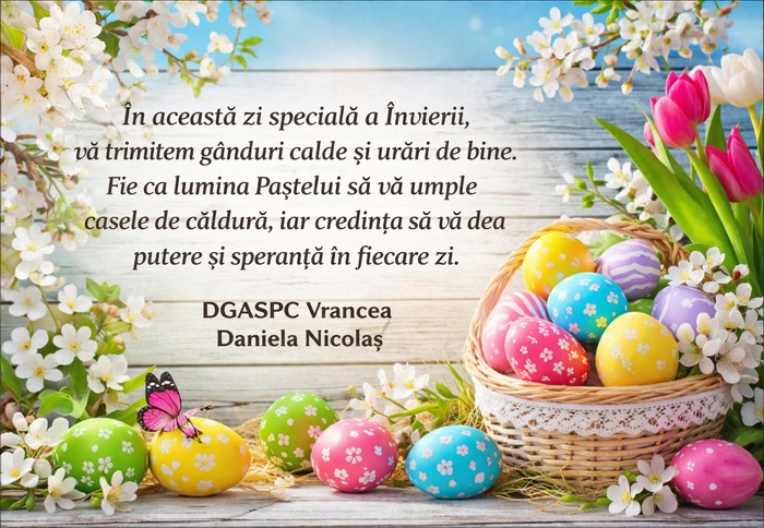 În aceste zile sfinte, când speranța renaște și inimile se deschid către lumină, colectivul DGASPC Vrancea transmite întregii comunități cele mai calde gânduri de pace, sănătate și bucurie.