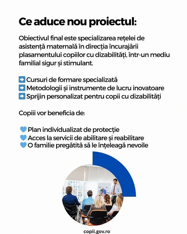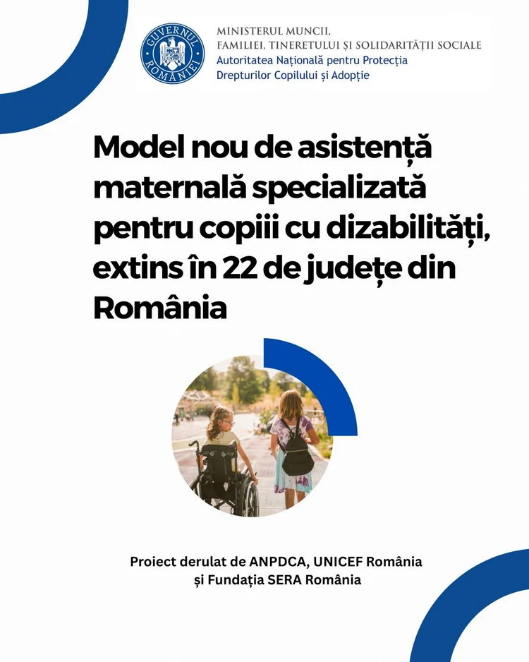 Autoritatea Națională pentru Protecția Drepturilor Copilului și Adopție împreună cu UNICEF România și SERA România au semnat un Memorandum pentru implementarea proiectului “Dezvoltarea și pilotarea unui model de asistență maternală specializată pentru copii cu dizabilități”. Proiectul are o durată de doi ani și vizează crearea unui cadru conceptual și operațional solid, care include analize de situație, cursuri de formare specializată, metodologii și instrumente de lucru inovatoare. O componentă esențială a inițiativei o reprezintă recrutarea și instruirea persoanelor care doresc să devină asistenți maternali specializați, pregătiți să răspundă nevoilor complexe de îngrijire ale copiilor cu dizabilități. Obiectivul final este specializarea rețelei de asistență maternală în direcția încurajării plasamentului copiilor cu dizabilități, într-un mediu familial sigur și stimulant.