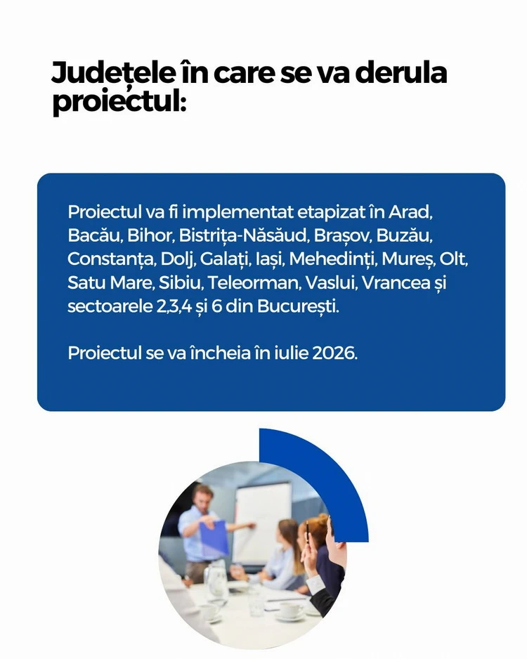 Acum proiectul a fost extins la 22 de județe/sectoare și va fi implementat etapizat în Arad, Bacău, Bihor, Bistrița-Năsăud, Brașov, Buzău, Constanța, Dolj, Galați, Iași, Mehedinți, Mureș, Olt, Satu Mare, Sibiu, Teleorman, Vaslui, Vrancea și sectoarele 2,3,4 și 6 din București. Proiectul se va încheia în iulie 2026, când va fi elaborat un raport complet de evaluare. Acesta va include și o propunere de sustenabilitate, cu scopul de a integra acest model de bune practici în politicile publice naționale, pentru a asigura un impact pozitiv pe termen lung.