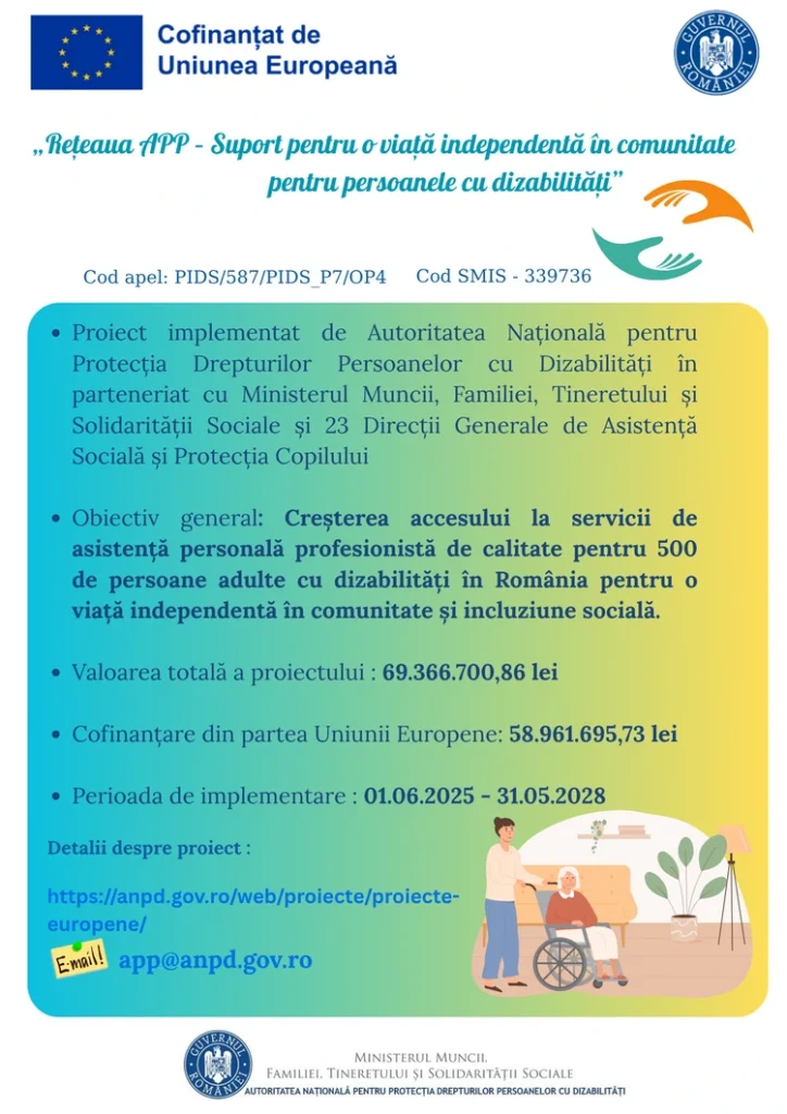 Începând cu 1 iunie 2025, DGASPC Vrancea s-a alăturat unui demers național de suflet: proiectul „Rețeaua APP – Suport pentru o viață independentă în comunitate pentru persoanele cu dizabilități”, cofinanțat din fonduri europene.