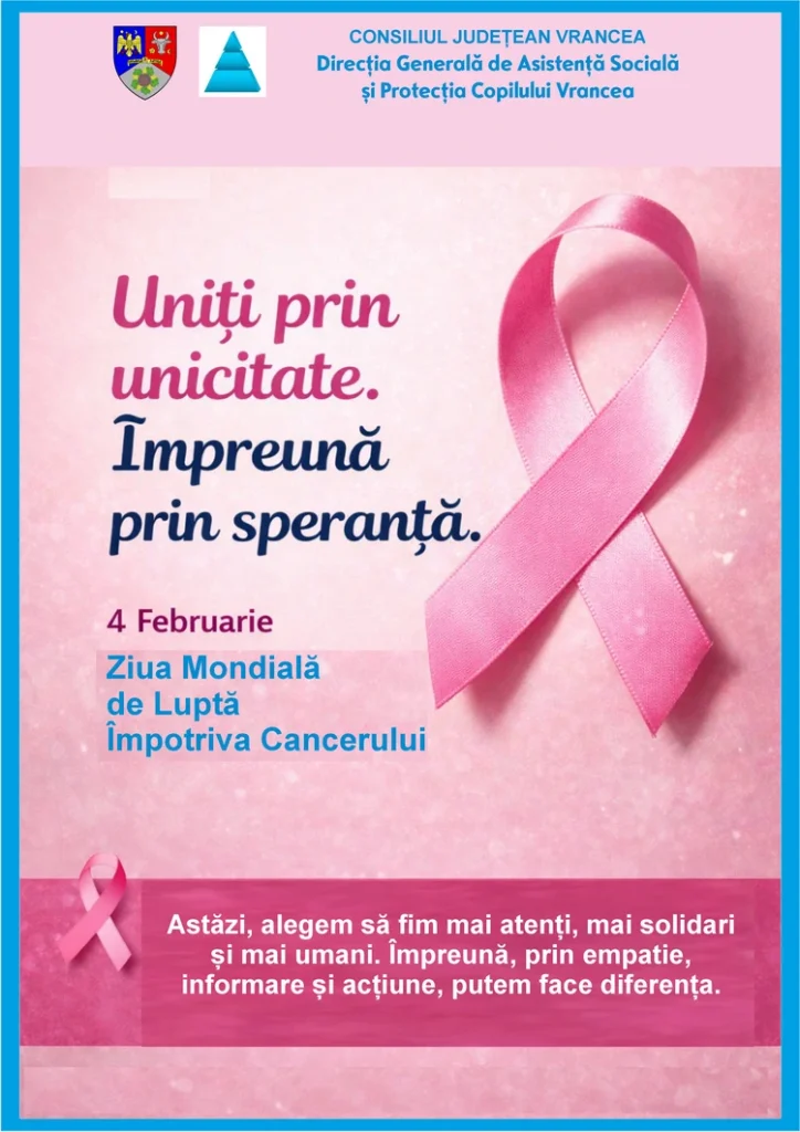 Astăzi, 4 februarie, marcăm Ziua Mondială de Luptă Împotriva Cancerului, un moment de reflecție, conștientizare și solidaritate cu milioanele de oameni care, zi de zi, duc o luptă curajoasă cu această boală. Cancerul nu este doar un diagnostic medical – este o încercare profund umană, care atinge vieți, familii și comunități întregi. Fiecare poveste este diferită, fiecare drum este unic, dar speranța și nevoia de sprijin sunt cele care ne unesc pe toți.