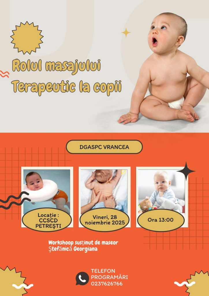 Direcția Generală de Asistență Socială și Protecția Copilului Vrancea organizează un nou workshop în cadrul programului educațional ’Școala părinților’, cu tema ‘Rolul masajului terapeutic la copii’. Evenimentul va avea loc vineri, 28 noiembrie 2025, începând cu ora 13:00, la Centrul Comunitar de Servicii pentru Copii cu Dizabilități Petrești.
