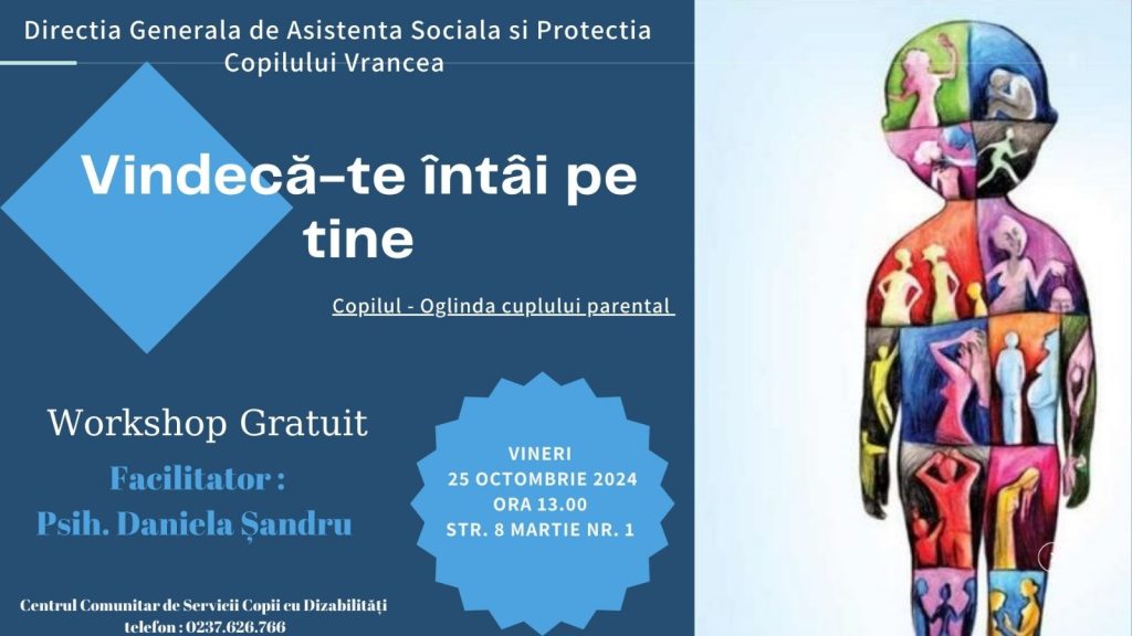 Direcția Generală de Asistență Socială și Protecția Copilului Vrancea (D.G.A.S.P.C. Vrancea), prin intermediul Centrului Comunitar de Servicii Copii cu Dizabilități Focșani, organizează workshop-ul cu tema ‘Vindecă-te întâi pe tine! Copilul oglinda cuplului parental’, în cadrul programului ”Școala părinților”, workshop ce va avea loc în data de 25 octombrie 2024.
